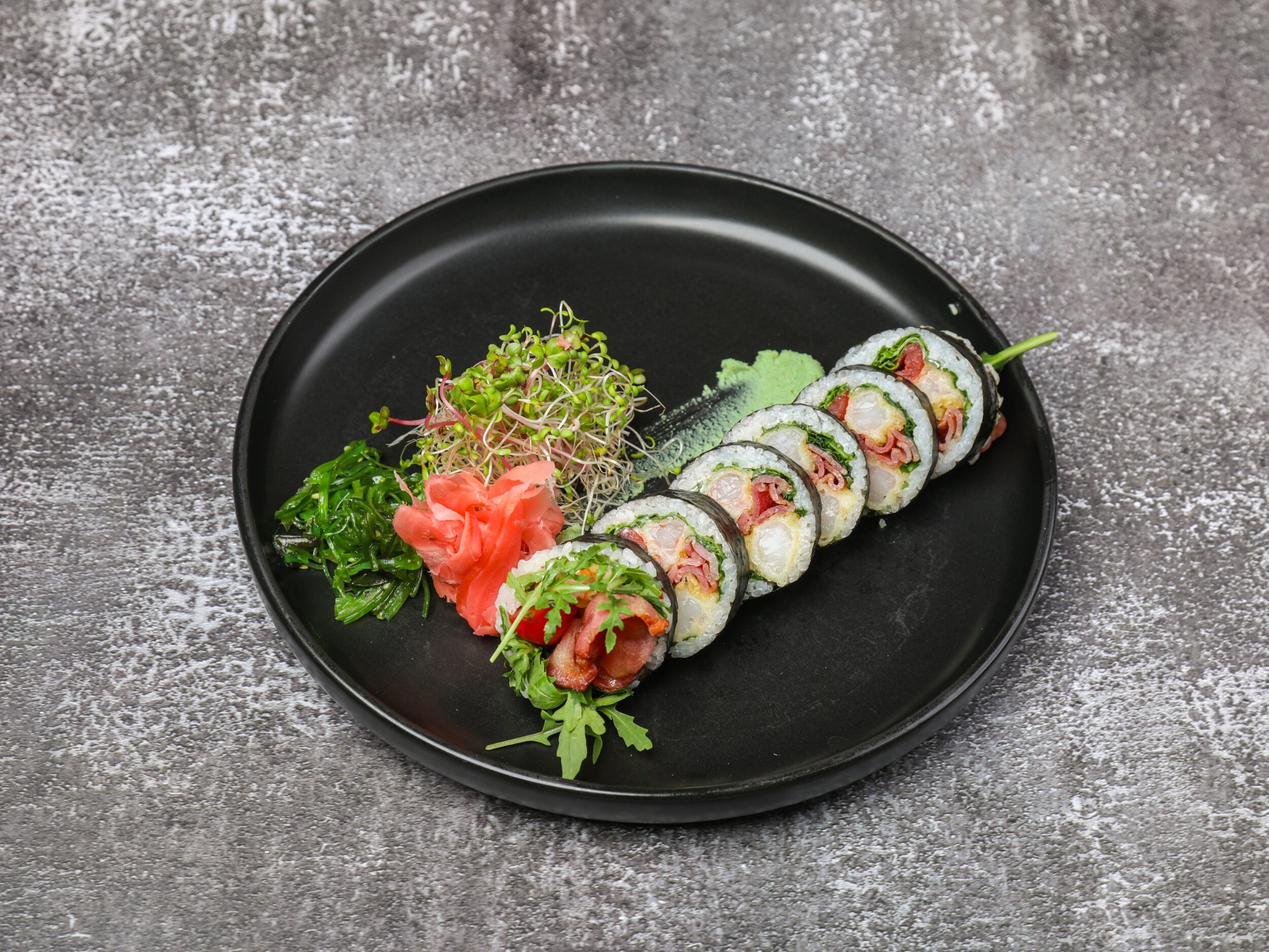 Futomaki z krewetką w tempurze, ogórkiem, oshinko i majonez truflowy