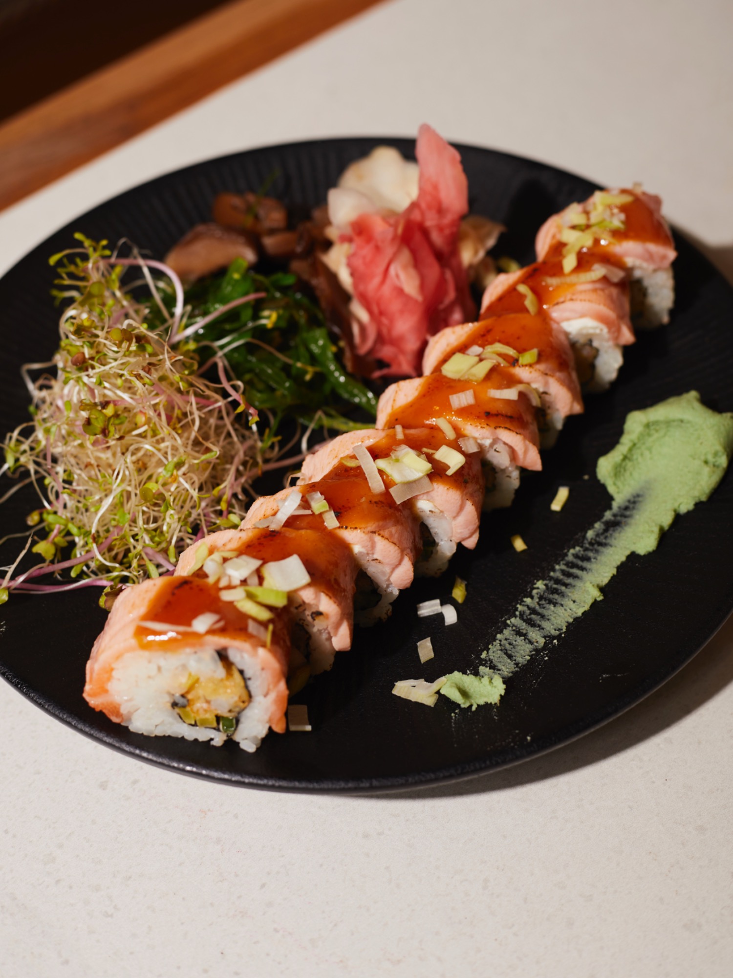 California hot sakana , w środku serek, paluszek krabowy, ogórek, na zewnątrz opalany łosoś z dresingiem oshinko, pora i imbiru